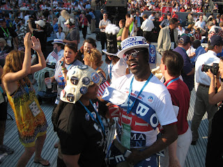 Inside it was hot, but festive. Slowly the place filled up as the sun went down, but I'd say upon my arrival at 4pm it was already half full and dancing. Celebs on stage - Black Eyed Peas, Stevie Wonder, Sheryl Crow, Michael McDonald. Walking around the crowd - Jesse Jackson, Sr. (!!!), Spike Lee (dancing with strangers and taking pics), Michael Dukakis, Tom Harkin, and a ton of folks who walked by being swamped by cameras but were lost on my general ignorance of famous folks. When Stevie played "Signed, Sealed, Delivered" the place exploded into one big dance party, which continued even after his set in some sections where folks just weren't slowing down. People in the aisles from different states hugging and dancing, taking photos, soaking it all in.